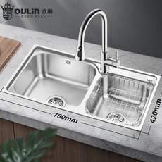 oulin水槽双槽304不锈钢拉丝厨房洗菜盆双盆窄台面适用76420